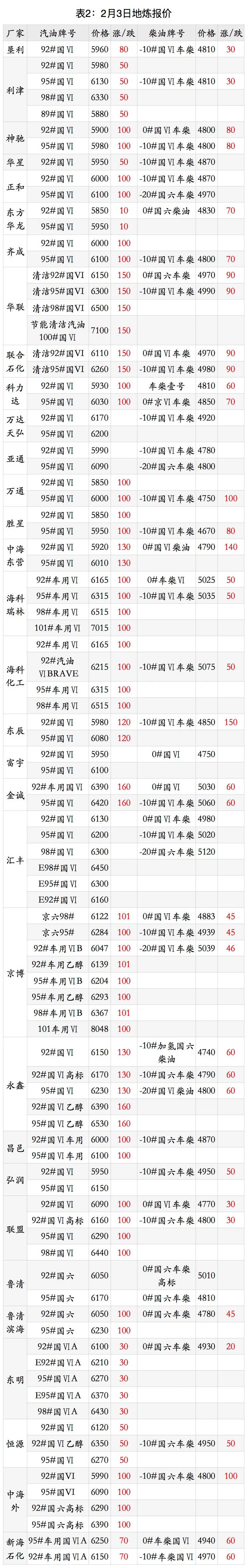 原油繼續上漲,下游積極補貨,市場成交活躍。昨日山東地煉上漲40-160元/噸。雖然缺乏需求支撐,但價格相對低位且貿易商積極囤貨,柴油出現限量銷售。同時,由于煉廠節前降庫存為主,漲幅受限,在30-70元/噸;汽油進入2月份后,補貨逐步增加,廠家推漲50-150元/噸,富海、利津、東營石化等有二調推漲。
