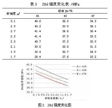 2.2 不同砂率及砂細度模數下混凝土28d強度的變化如表3、圖2。