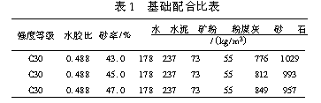 本次采用C30配合比、3個砂率進行了試驗,3個砂率分別是43%、45%、47%,砂細度模數采用3.1、2.9、2.7、2.5、2.3、2.1、1.9、及1.7八個級別,試驗是使混凝土初始坍落度達到(210±10)mm時聚羧酸高性能減水劑的摻量及其3、7、28、56d的強度。3個砂率的基礎配合比如表1所示。